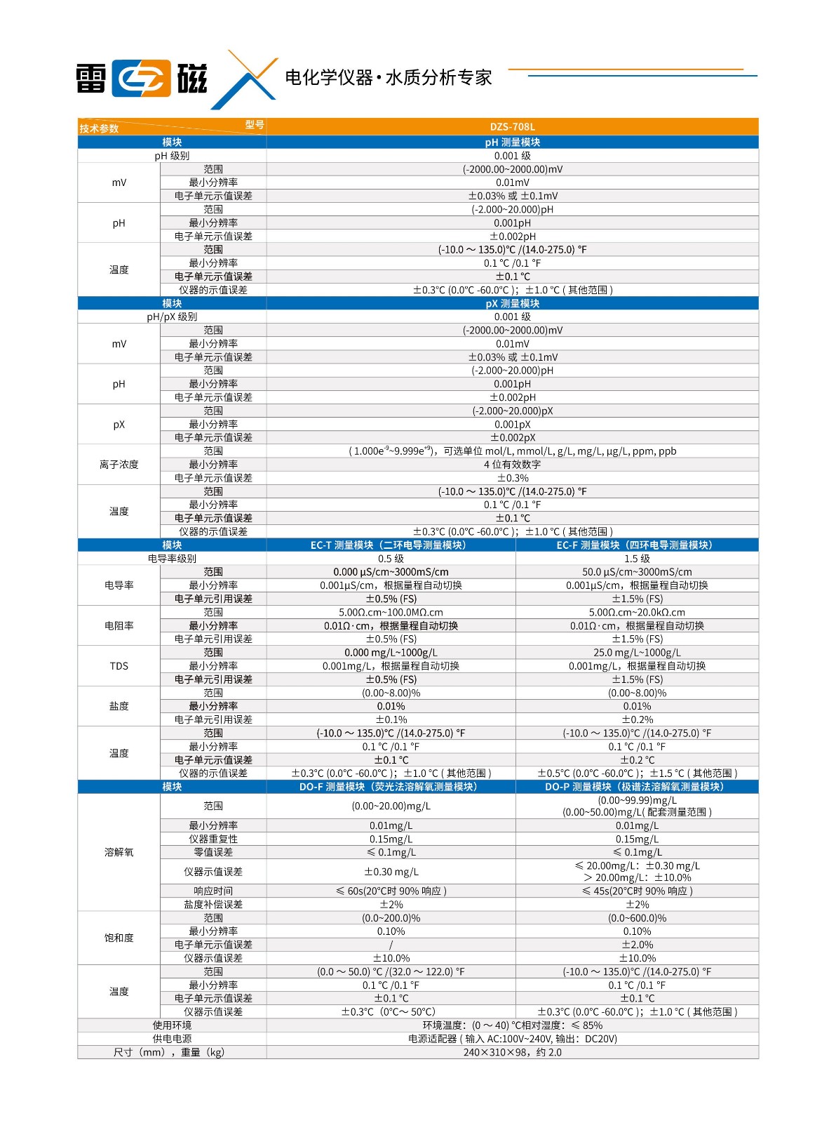 • 关 键  字: pH/pX 级别: 0.01 级 电导率级别: 1.0 级 pH/pX: (-2.00~20.00) pH/pX mV : (-2000.0~2000.0)mV 离子浓度: (0~19990),可 选单位 mol/L, mmol/L, g/L, mg/L, μ g/L 电导率: 0.000 μ S/cm~ 1000mS/cm 电阻率: 5.00Ω.cm~20.00M Ω.cm TDS: 0.00 mg/L~300g/L 盐度: (0.00~8.00)% 溶解氧: (0.00~50.00)mg/L 饱和度: (0.0~300.0)% 温度: (-5.0~110.0) ℃ 配套测量范围: (0.00~ 14.00) pH/pX (0.00~50.00)mg/L