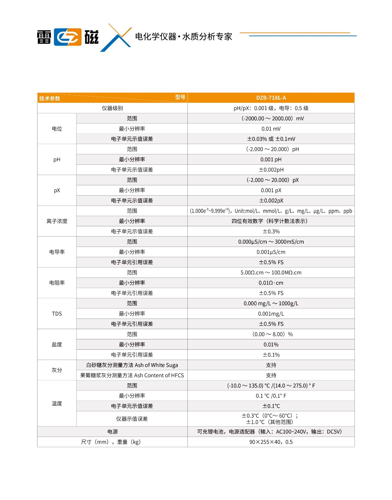 • 关 键  字: 级别: pH/pX:0.001级; 电导率:0.5级 pH/pX: (-2.000~20.000)pH/pX 电子单元示值误差:±0.002pH/pX mV:(-2000.00~2000.00)mV 离子浓度:(1.000e-9~9.999e+9),可选单 位mol/L,mmol/L,g/L,mg/L,μg/L,ppm, ppb 配套测量范围:(0.000~14.000)pH/pX 电导率:0.000μS/cm~3000mS/cm 电阻率:5.00Ω·cm~100.0MΩ·cm TDS:0.000mg/L~1000g/L 盐度:(0.00~8.00)%